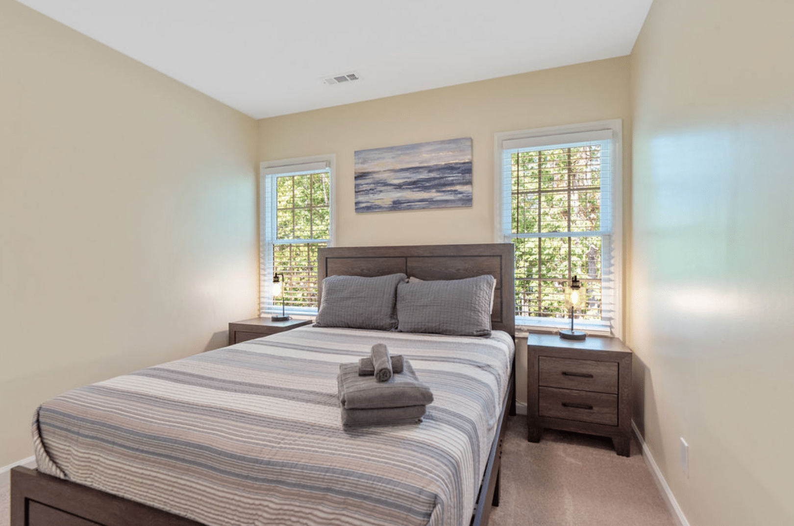 Upstairs, the primary suite includes a king bed, walk-in closet, and private ensuite bathroom with a soaking tub. Two additional bedrooms feature queen beds and are thoughtfully furnished for comfort and convenience.