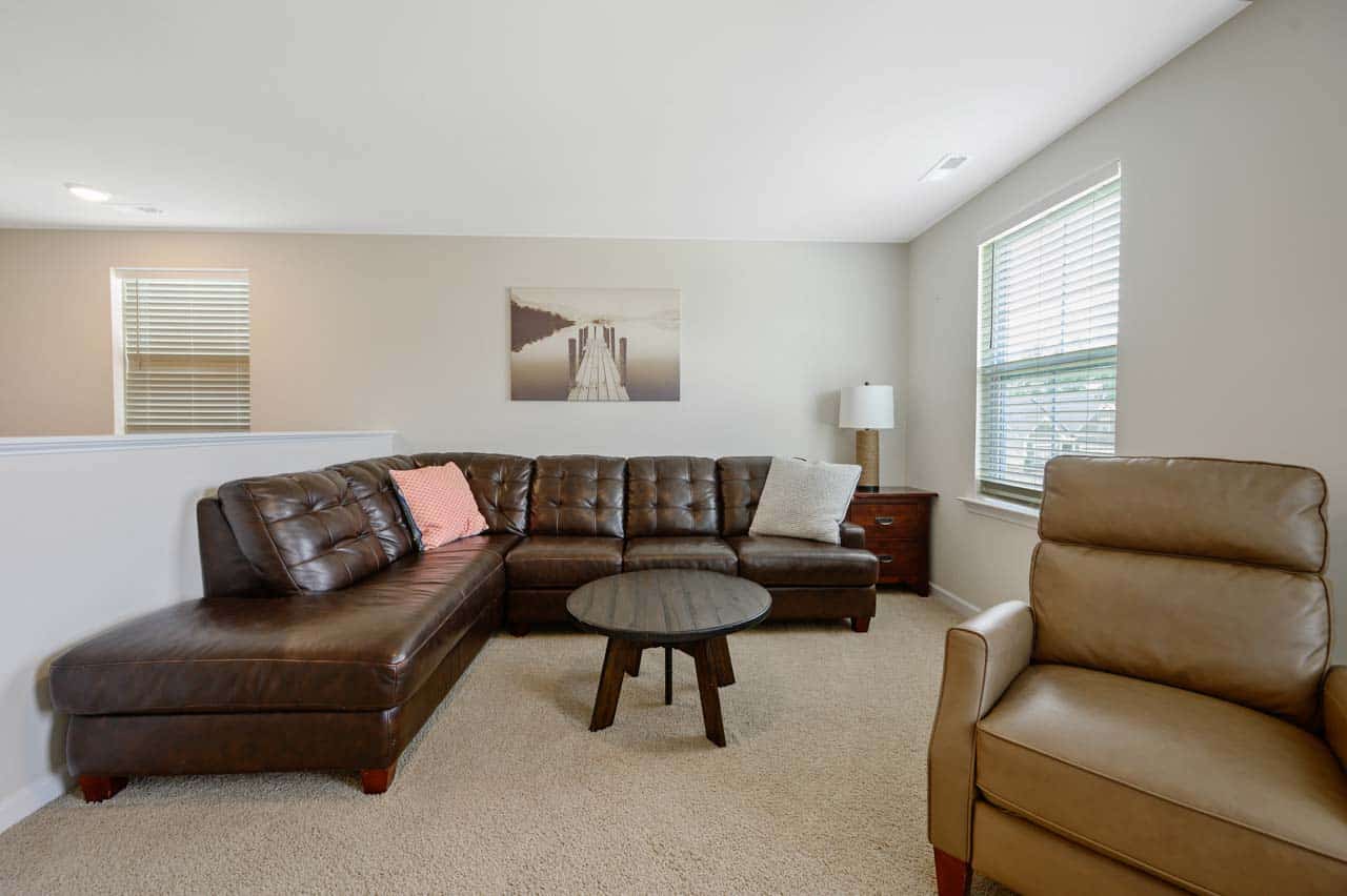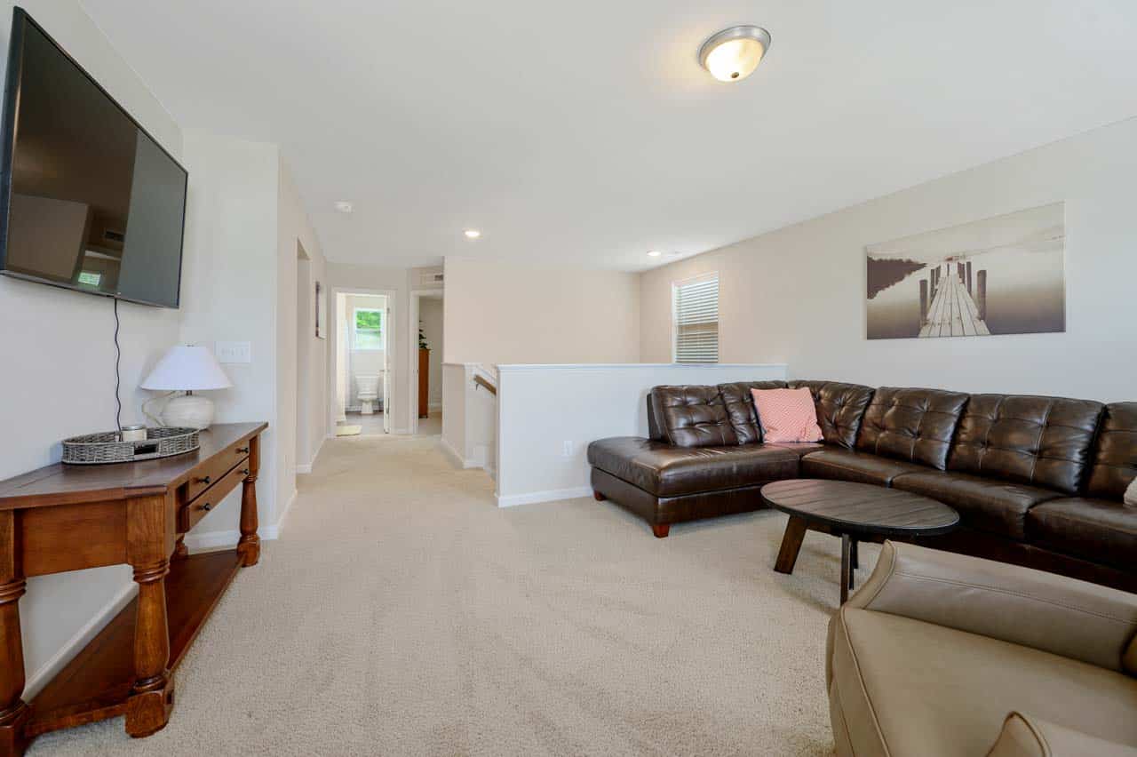 Upstairs, a second living room with a cozy sectional and large TV provides additional space for relaxation, ideal for families or groups traveling together.