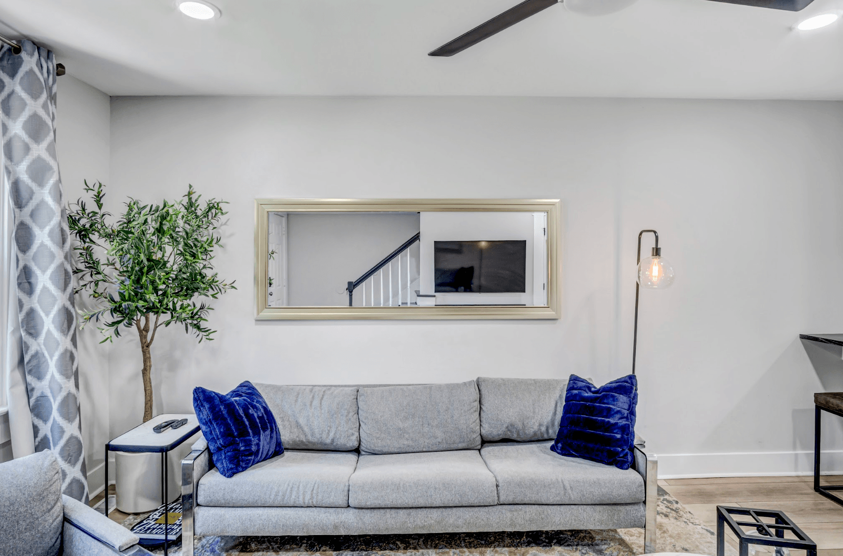 The spacious living room welcomes you with stylish décor, comfortable seating, and a Smart TV with Roku for streaming your favorite shows.
