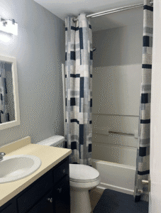 The shared bathroom is newly updated with modern fixtures and a clean, fresh design. Towels and toiletries are provided for your convenience.